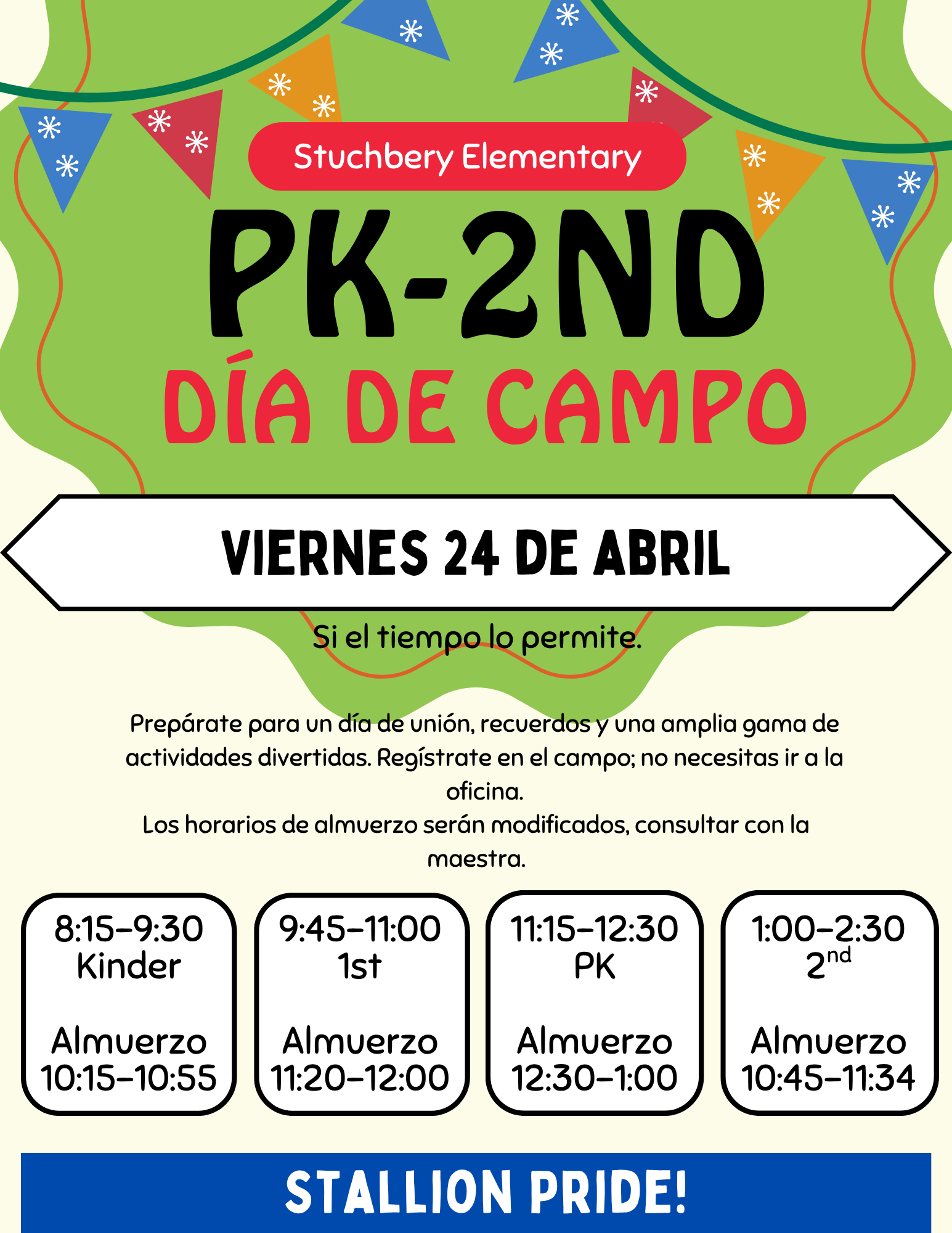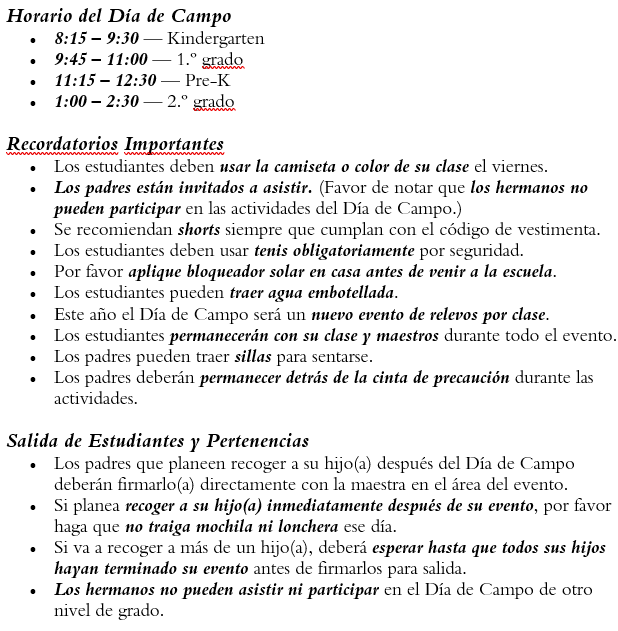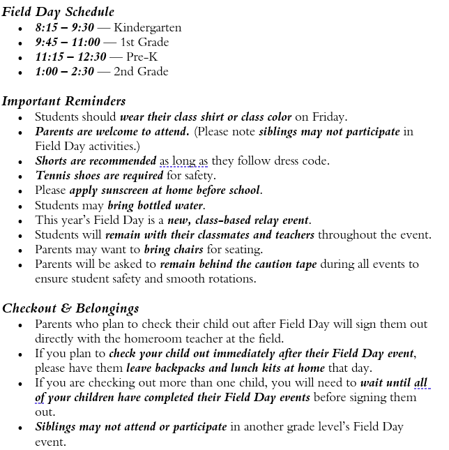 Please read the information below for tomorrow's PK-2nd Grade's Field Day events.